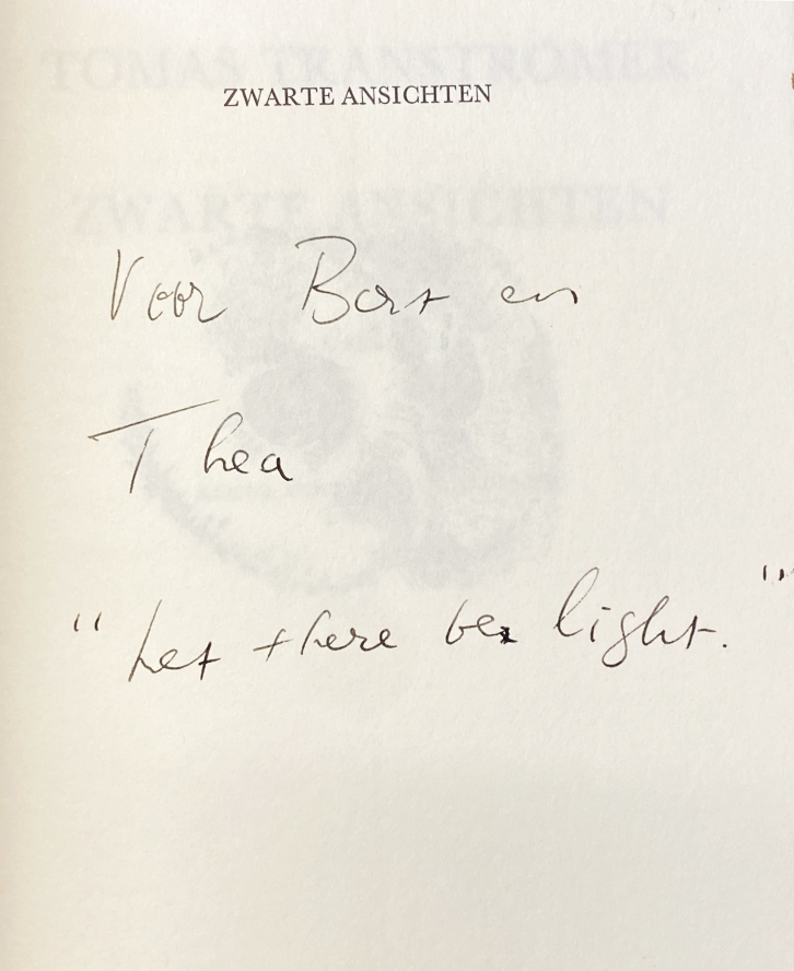 * Exemplaar met handgeschreven, ongesigneerde opdracht van Bernlef op de Franse titel: ‘Voor Bert [Schierbeek]/ en Thea/ “Let there be light”‘. Tranströmer (1931-2015) zou de Nobelprijs voor Literatuur winnen in 2011.