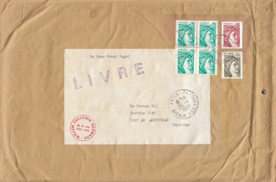 23. HERMANS, W.F. Envelop (leeg). Met bubbelplastic gevoerde A5-envelop, door Hermans met de typemachine geadresseerd aan Ernst Nagel, hoofd productie van De Bezige Bij. Met rondstempel in rood (met daarin Hermans’ naam en zijn Parijse adres) en in zwart het stempel ‘LIVRE’. Met zes postzegels (gezamenlijke frankeerwaarde fr.fr. 1,90). Datum poststempel 20 februari 1980. Leeg (maar misschien is er nog wat DNA op te graven uit de diepten van deze envelop).