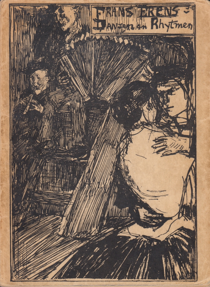 24. (ISRAËLS, Isaac). ERENS, Frans Dansen en Rhytmen. Amsterdam, Versluys, [1891]. Ingenaaid (omslagontwerp van Isaac Israëls). (4), 136 p. 1e druk. Debuut. Rug licht beschadigd, omslag wat verbruind, voorzijde omslag en eerste veertien pagina’s liggen los. Exlibris van Gerrit Komrij op titelpagina.