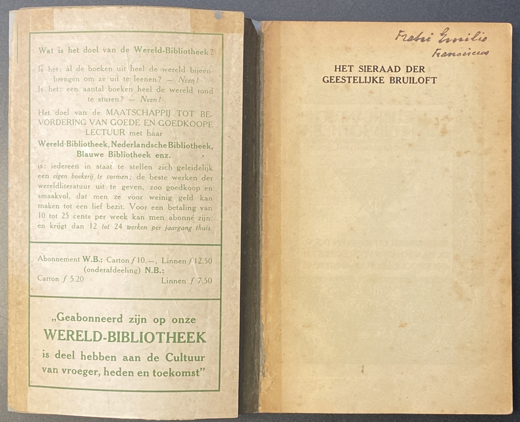 39. RUUSBROEC, Johannes Het sieraad der geestelijke bruiloft. In hedendaagsche taal overgebracht door Mr. Frans Erens Amsterdam, Mij voor GGL, 1917. Ingenaaid met stofomslag. XVIII, 226 p. Stofomslag gerepareerd met zuurvrije tape. Roestig.