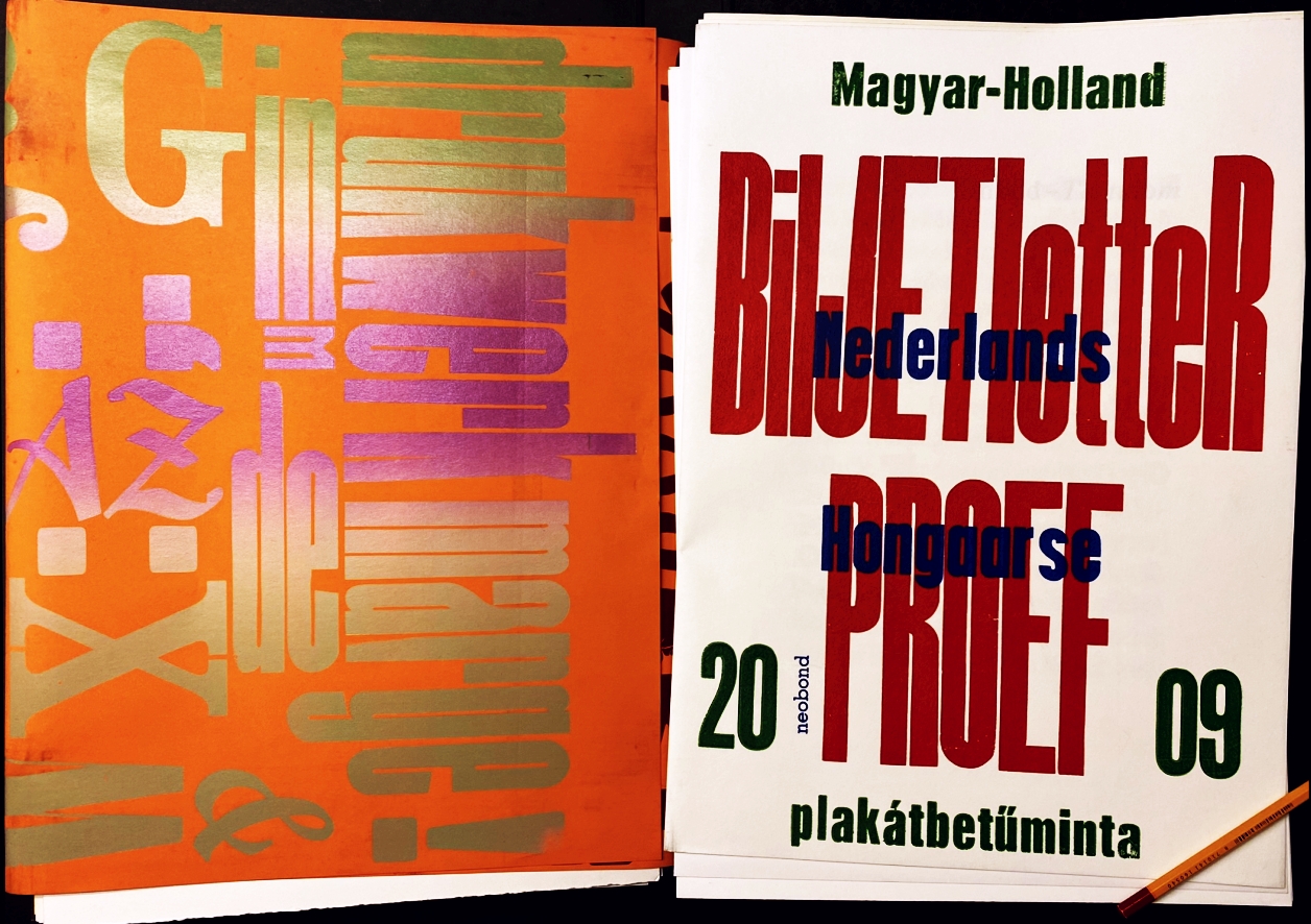 * Reusachtig project vol expressiviteit. Uit het juryrapport van Mooi Marginaal 2008-2009: ‘In een oplage van 55 exemplaren maakten 47 drukkers twee druksels op A3 formaat. Iedere drukker kreeg een letter, cijfer, of teken toegewezen. De opdracht was uitsluitend biljetletters te gebruiken, van minimaal 3 cicero tot zo groot als beschikbaar. Het grootste corps was 132 cicero. Op het eerste vel moest alleen de toegewezen letter worden gebruikt, het tweede was voor vrije grafiek. Het Nederlands-Hongaarse project trok 35 Nederlandse deelnemers en 12 Hongaarse. Het resultaat is een letterproef van het letterbezit van de drukkers, hetgeen indrukwekkend is. Elke bijdrage is anders en verrassend, van ingetogen zwart-wit grijs tot zeer kleurrijk. Het drukplezier komt je door de hele map tegemoet.