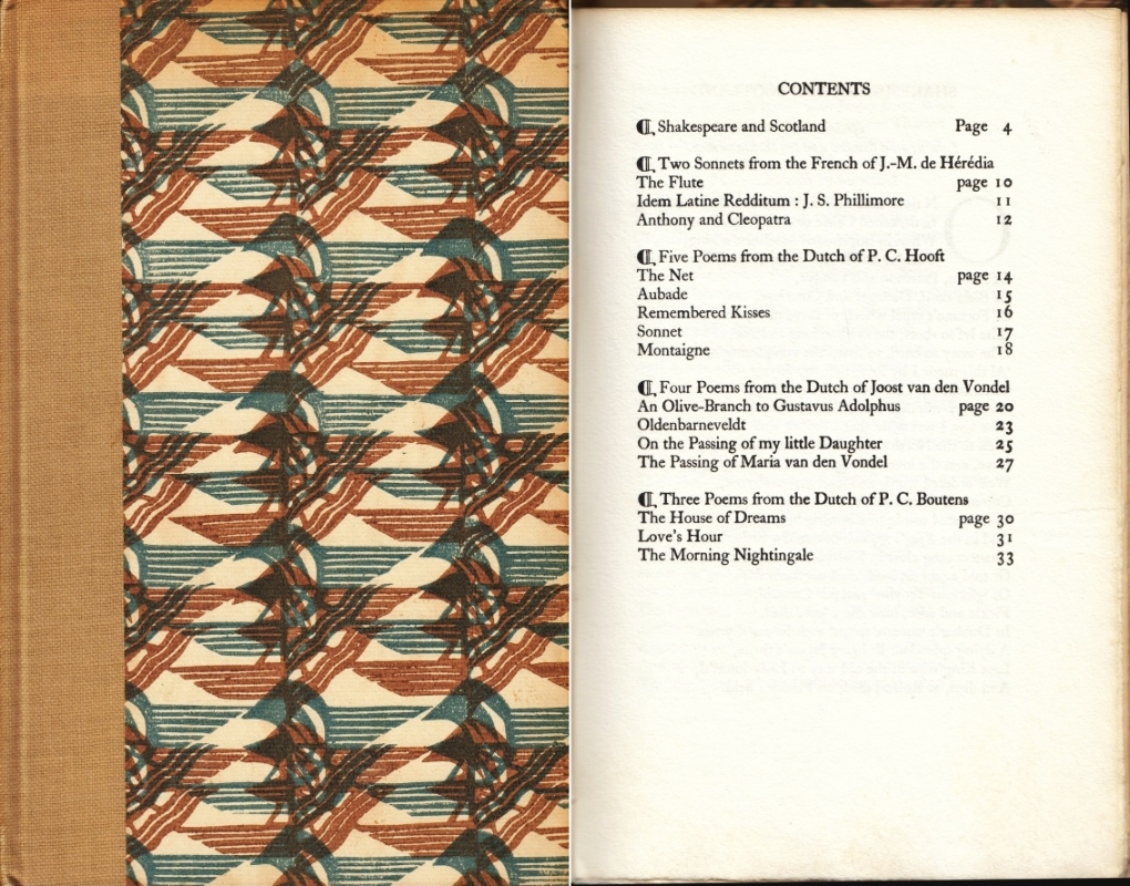 * De bibliofiele drukkerij Samson Press bestond van 1930-1967, een van de weinige die gerund werd door vrouwen. Dit mooie boek bevat naast een oorspronkelijk gedicht van H.J.C. Grierson ook door hem in het Engels vertaalde gedichten van J.M. de Héredia, P.C. Hooft, Joost van den Vondel en drie vertaalde gedichten van P.C. Boutens: ‘The House of Dreams’, ‘Love’s Hour’ en ‘The Morning Nightingale’. Rijkse 4.3.