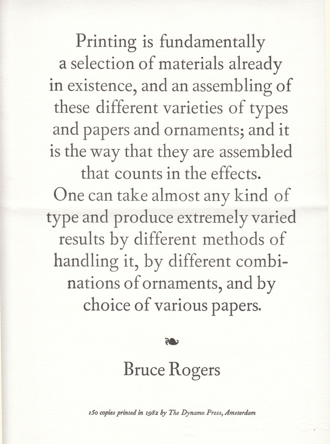 29. ROGERS, Bruce ‘Printing is fundamentally…’. Amsterdam, Dynamo Press, 1982. 32,5 x 24,8 cm. Planodruk. Met de hand gedrukt in 150 exemplaren op Johannot. Horizontale vouw.