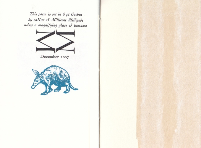 * Waarschijnlijk gedrukt in 36 exemplaren. Mooie mini-uitgave uit de serie Aardvark Apocrypha: “This poem is set in 6pt Cochin by OsKar & Millicent Millipede using a magnifying glass & tweezers”.