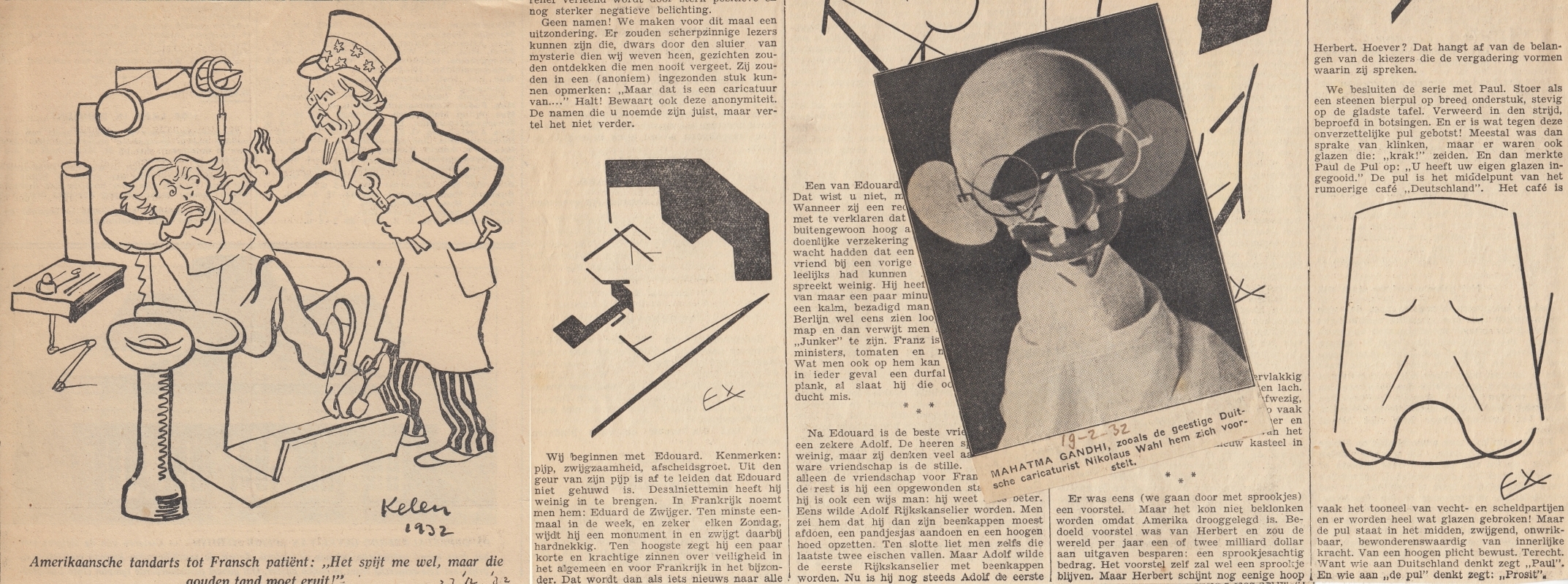 * Vooral politieke portretjes, veel staatshoofden uit de tijd van de Volkenbond-bijeenkomsten in Genève (door Imre Kelen / Alajos Dezsö of Derso) e.d. Maar ook heel mooie grote tekeningen van b.v. Wam Heskes en Jantje (=Felix Hess), de laatste over Sinterklaas. (Wie herkent de politici in deze krantenknipsels? Oplossingen onderaan deze nieuwsbrief)