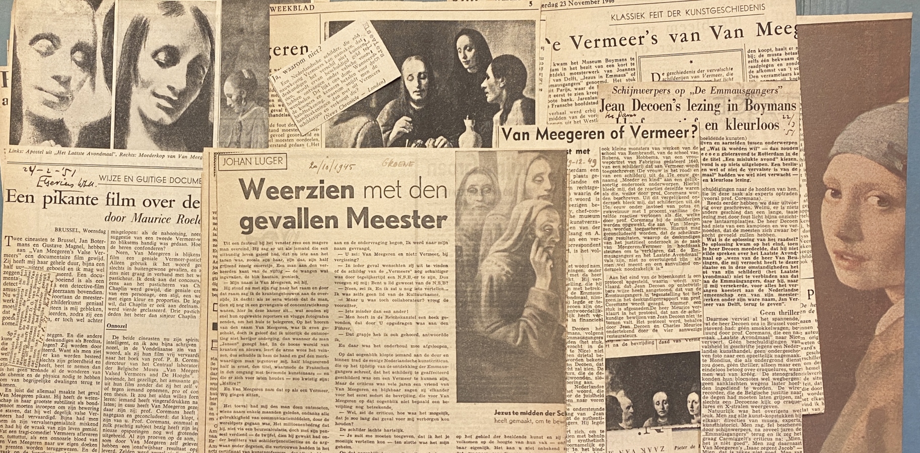 26. KUNSTVERVALSING Map met ca. 120 krantenknipsels. Grote en kleine (en minuscule) krantenknipsels over de vervalsingen en de processen rond Han van Meegeren (1946-1951), met enkele voorafgaande knipsels over kunstvervalsing uit de oorlogsjaren). Verzameld door Kees Lekkerkerker (1910-2006) en door hem zorgvuldig uitgeknipt en gedateerd.