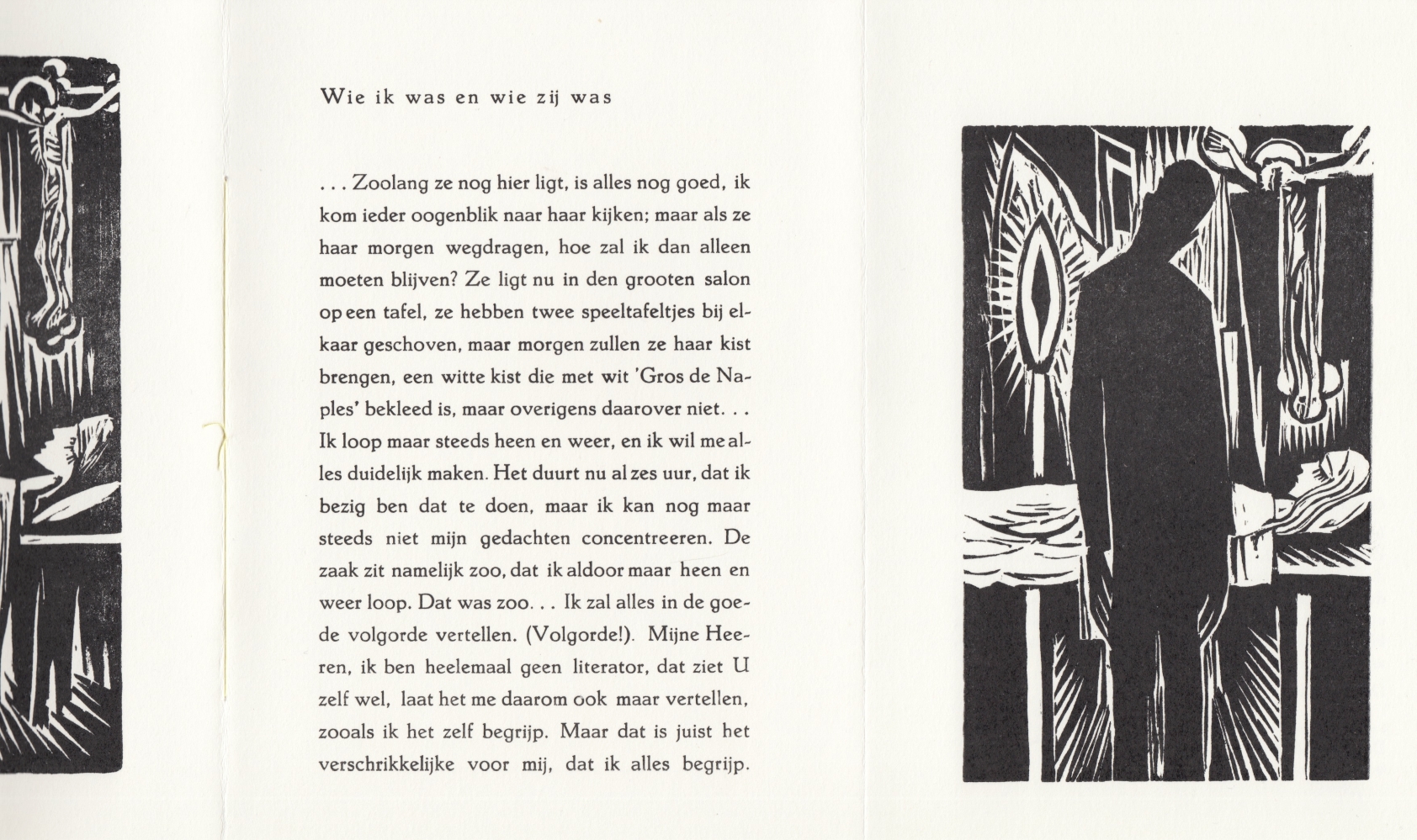 17. DIJKSTRA, Johan / DOSTOJEWSKY, Fjodor M. Uit De Zachtmoedige. Eén voorstelling, twee houtsneden. Groningen, De Vier Seizoenen, 1996. Cahiersteek. In feite een in omslag genaaide leporello van 8 bladzijden. Gezet uit de Hollandse Mediaeval en gedrukt in rood en zwart in een genummerde, maar onbekende oplage (125?). De houtsneden zijn van de blokken gedrukt op de naar binnen geklapte bladen. Zeer frisse uitgave.