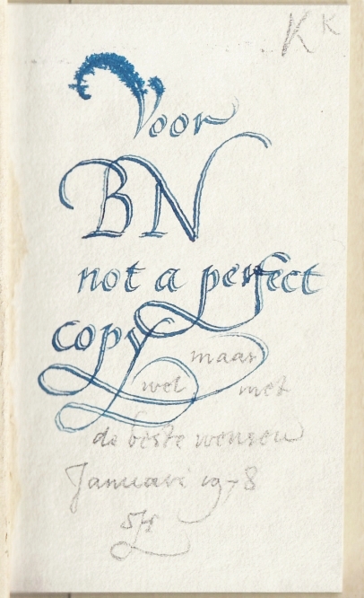 * Dit exemplaar heeft een gecalligrafeerde opdracht van Sem Hartz, de drukker van de Tuinwijk Pers, aan de grote boekenverzamelaar Bob Nijkerk: ‘Voor BN, not a perfect copy, / maar wel met de beste wensen Januari 1978 SH’. Het eerste deel is geschreven in blauwe inkt, het tweede deel van de opdracht in potlood. Daarboven zette Nijkerks zoon Karel zijn kenmerkende paraaf ‘K’.