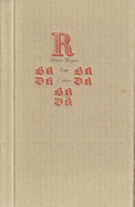 44. (TUINWIJK PERS). ROGERS, Bruce Four Unpublished Letters by Bruce Rogers to S.H. de Roos. (Haarlem, Tuinwijk Pers, 1975. Miniboekje: 10,5 x 7,0 cm. Ingenaaid. Omslag met een grote R en kapitalen BR / DR in rood, daartussen de schrijver en titel in zwart. (28) p. Gezet uit de Cancelleresca Bastarda en de Romulus op grijs geschept papier in een oplage van 25 exemplaren. 1e druk.
