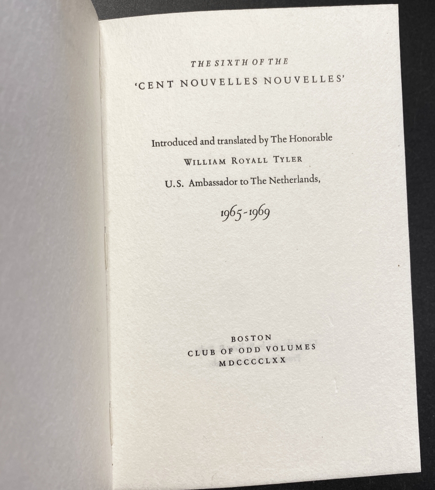 40. TUINWIJK PERS The Sixth of the ‘Cent Nouvelles Nouvelles’. Introduced and translated by The Honorable William Royall TYLER, US Ambassador to The Netherlands, 1965-1969. Boston, Club of Odd Volumes, 1970. Soepel imitatieperkament (een verraderlijk goede imitatie!). Met de hand gezet uit de Romanée en gedrukt door De Tuinwijkpers in rood en zwart op Japans papier in een oplage van 200 genummerde exemplaren. Met twee kopergravures op postzegelformaat, gedrukt in roodbruin (met herkenbaar zicht op ‘s-Gravenhage) en groen.