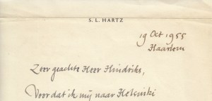 38. (TUINWIJK). HARTZ, S.L. Handgeschreven brief aan ‘Zeer geachte heer Hindriks’. Op papier met voorgedrukte naam en adres, ongetwijfeld naar ontwerp van Hartz zelf. 10 regels, met vulpen beschreven. Gedateerd ’19 Oct. 1955/ Haarlem’. Wat gekreukt en gevlekt.