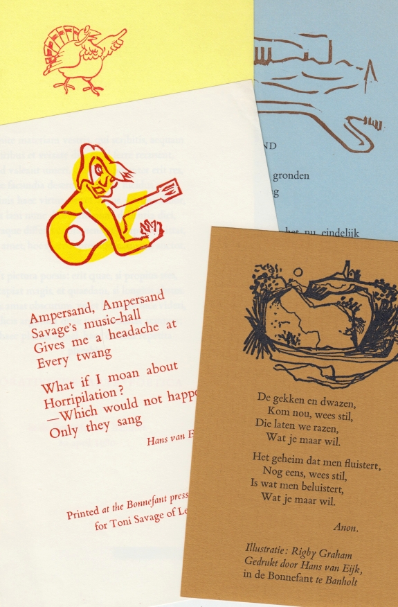 7. (BONNEFANT, IN DE). SWEENEY, Matthew Ratatouille. Drawings by Rigby Graham. Ballyliffin & Leicester, Aardvark Press (= In de Bonnefant), 2007. 9,0 x 6,1 cm. Cahiersteek, origineel omslag van decoratief Japans papier. 12 p. Gedicht met 4 illustraties (in kleur gedrukt) en een uitgeversvignet.