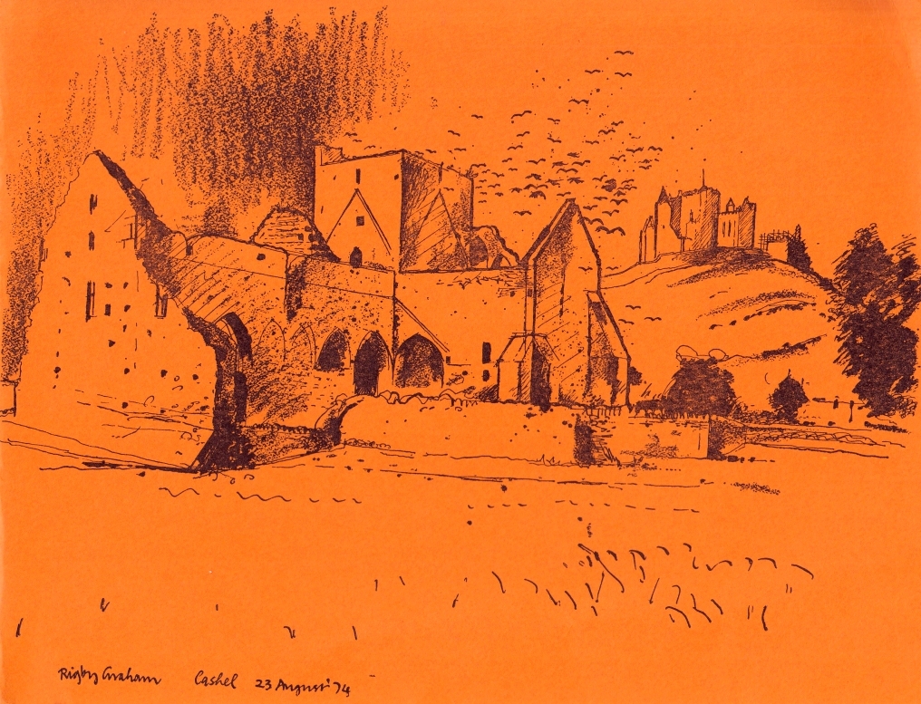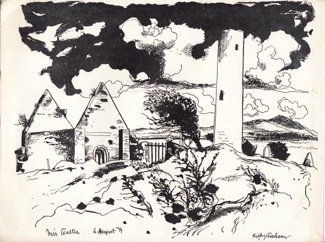 * Twee sfeervolle tekeningen van een klooster, gesticht in 636, met uitvoerige tekst van illustrator Graham. Kerstwens. Deel 3 van een serie van 6 monografieën over Ierse kloosterruïnes. Alle tekeningen in de serie zijn gedateerd in augustus 1974, maar in welk jaar de boekjes gepubliceerd werden is niet duidelijk.