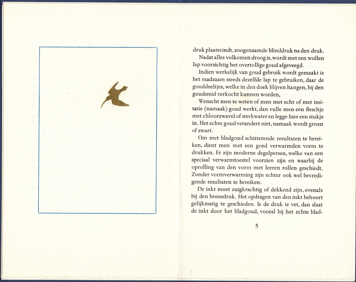 Deze uitgave bevat een tekst over het drukken met bladgoud uit het handboek Van leerling tot drukker door D. Schuitmaker en L. Ronner. Projecten DIDM B-1. Zonder opdracht leverbaar voor € 45. Breugelmans 89.