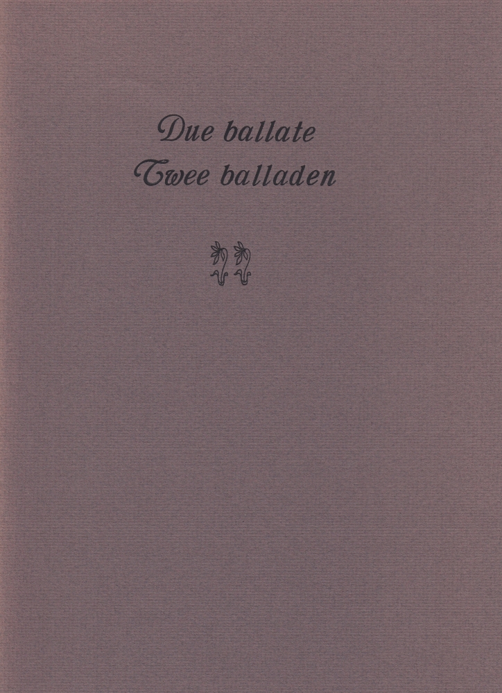 33. POLIZIANO, Angelo Twee balladen. Due ballate. (Met een kleurenets van Olga Vychodilova). Baarn, Arethusa Pers, 1990. Cahiersteek. (12) p. Vertaling (en nawoord): Frans van Dooren. Tweetalig, Italiaans en Nederlands. Gedrukt door de Clipeus Pers in een oplage van 100 genummerde exemplaren. Omslag rond rug licht verschoten.