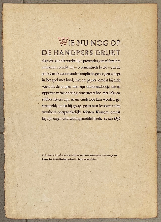 10. (DOES, Bram de). DIJK, C. van Wie nu nog op de handpers drukt. Haarlem, Leo Vos, 1984. 51 x 36 cm. Plano. Gedrukt in rood en zwart op beige Zaans Bord met schepranden. Typografie Bram de Does. 1e druk.