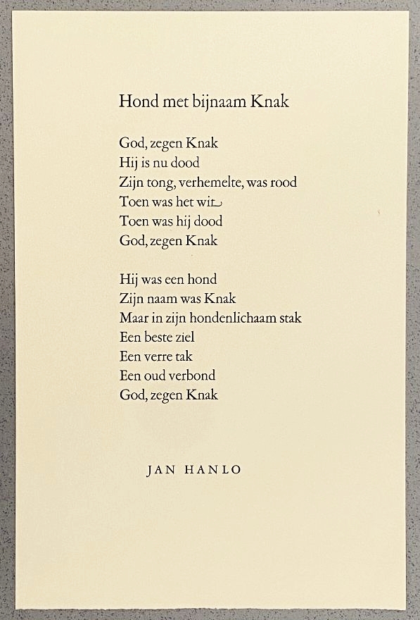 * ‘God, zegen Knak’. Elementair gedicht van Hanlo, dat op deze grote plano alle ruimte krijgt.