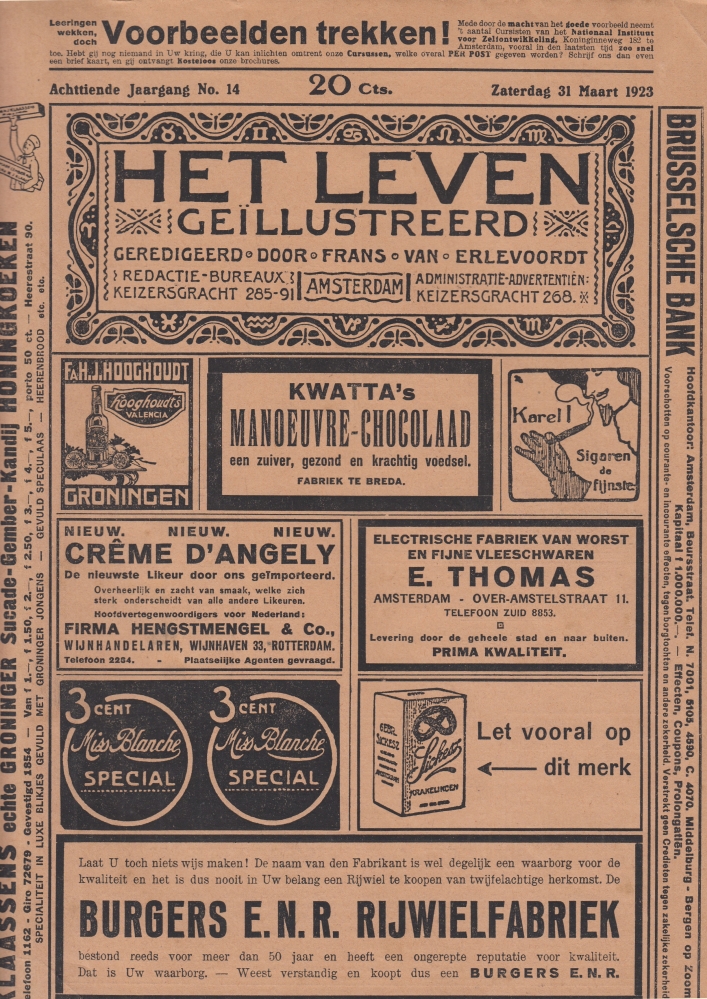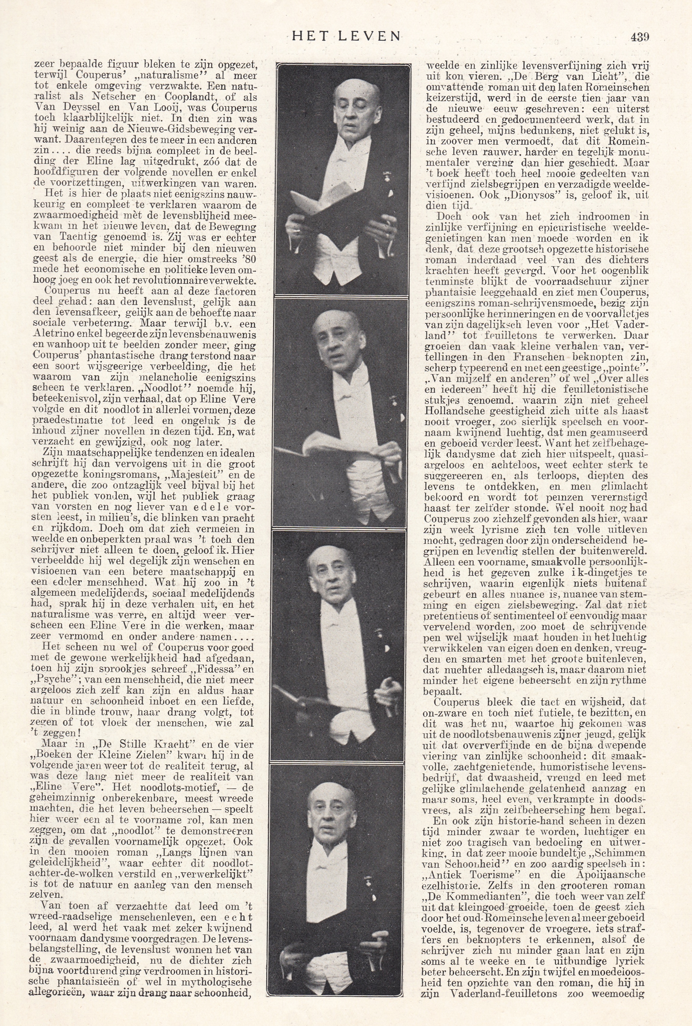 * Geïllustreerd artikel over Couperus, die 60 zou worden op 10 juni 1923 – dus Het Leven was er vroeg bij. Met foto’s waarop Couperus uit zijn werk voorleest. Ook over ‘De Amsterdamse effectenbeurs in de open lucht’, de moordaanslag van Valkenswaard en het overlijden van Sarah Bernhardt, Willem Kloos, de ‘Profeet Johannes’ uit Gorssel en ‘de Fox-Blue, de Parijsche dans van dit oogenblik’ met muziek van Raoul Moretti.