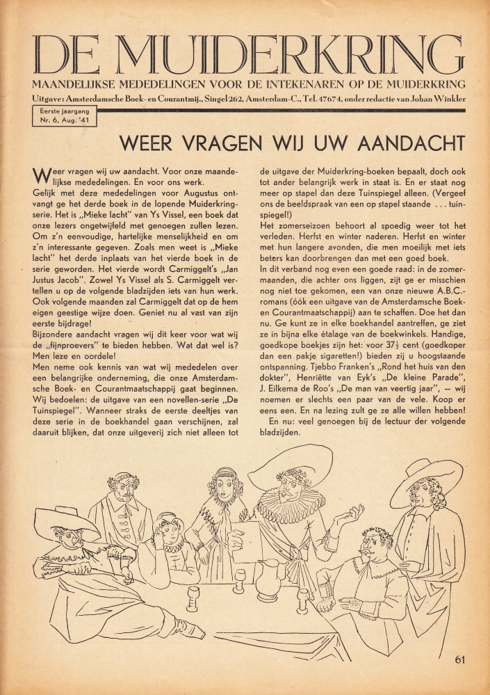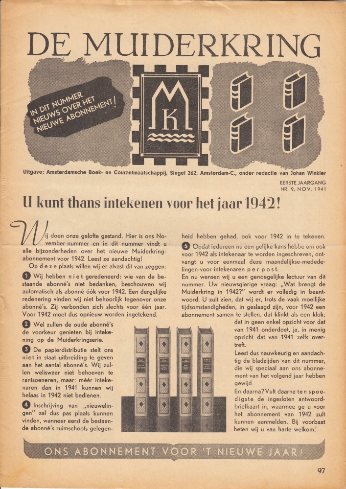 * 1. De Muiderkring. Maandelijks huisorgaan voor de intekenaren op de Muiderkring. 29 x 20 cm. Jg. 1 nr. 1-6, 8-10 (maart-december 1941); jg. 2 nr. 1 (jan. 1942). Het novembernummer werd in gewijzigde vorm herdrukt als losse folder van 8 p. met de titel ‘Wij bieden u aan: De Muiderkring 1942’. Met o.a. Mars buiten dienst van Max Dendermonde, Het schip Nieu-Hoorn van Max van Amstel, Albert Helman Afdaling in de vulkaan en Henk Breuker: Kinderen spelen toneel (alle met duidelijk herkenbaar omslagontwerp van Ben Mohr). Redactie Johan Winkler.