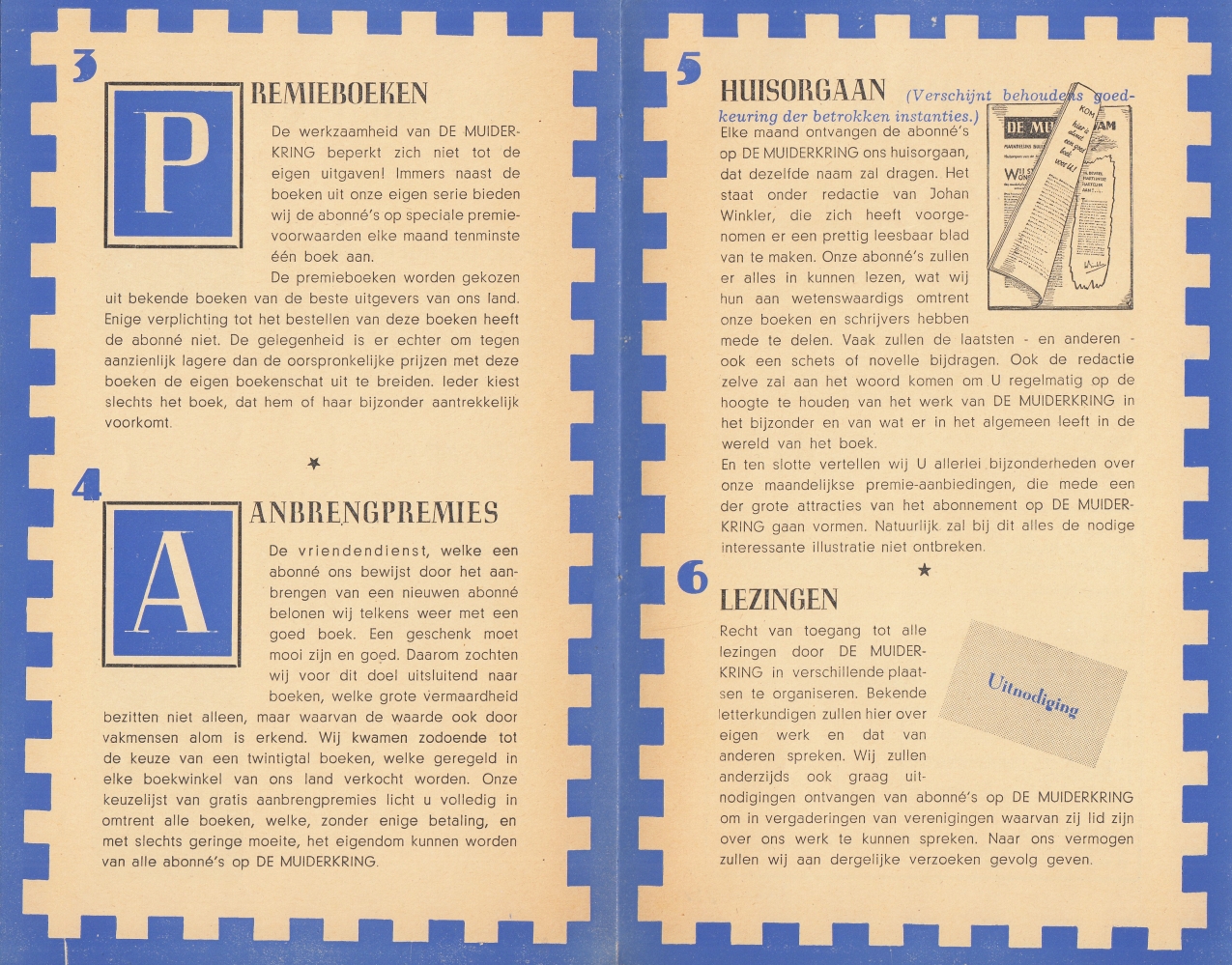 4. Boekenclub De Muiderkring met Commissie van Aanbeveling waarin Antoon Coolen, Willem Elsschot en Anton van Duinkerken. Samenwerkende uitgevers: Amsterdamse Boek- en Courant-mij, P.N. van Kampen, H.P. Leopold, J.M. Meulenhoff en Em. Querido. Najaar 1948.
