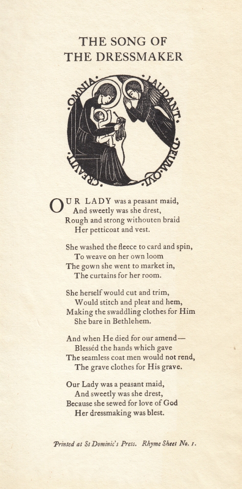 12. GILL, Eric The song of the Dressmaker. Rhyme Sheet No. 1. [Ditchling], St. Dominic’s Press, [1923?]. 30,5 x 16 cm. Gedrukt op handgeschept papier, alleen recto. Met een houtsnede (gedrukt in zwart) van Eric Gill: Maria breiend met het Kind op haar schoot, begroet door een engel. Met in een cirkel een Latijnse zin, Laudant Deum qui creavit omnia (‘Zij prijzen God die alles geschapen heeft’). Diameter 68 mm.