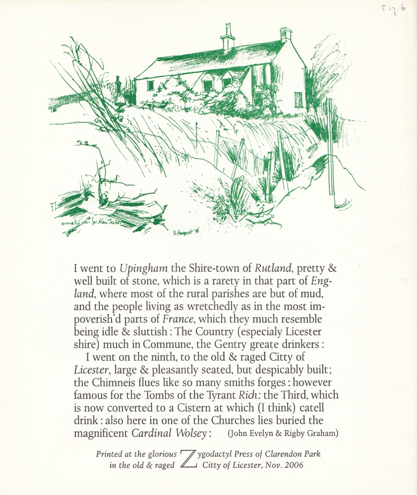 2. John EVELYN & Rigby GRAHAM: (tekst over ‘the old and ragged City of Leicester’) met een tekening van Rigby Graham.