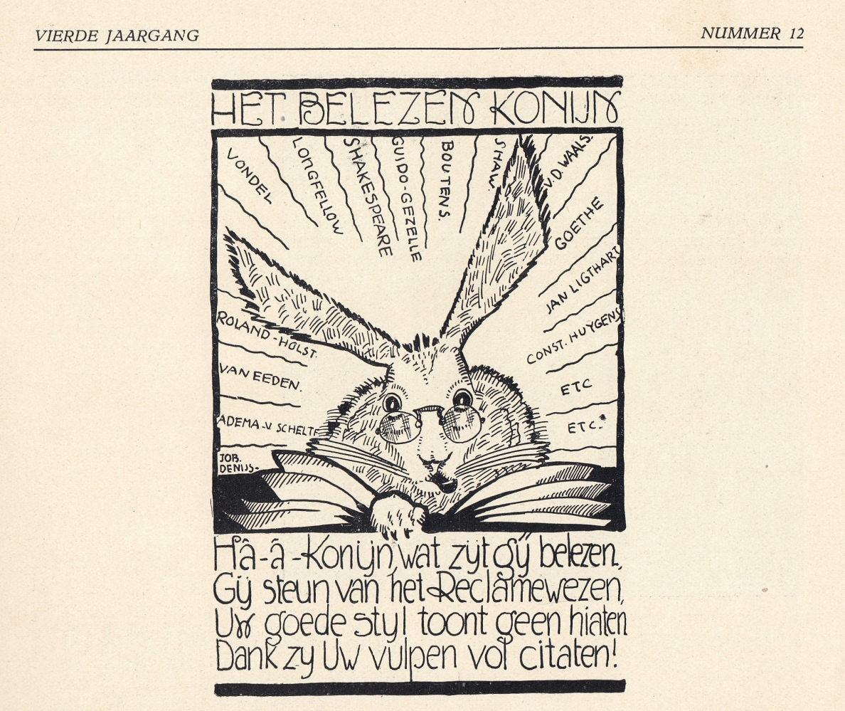 * Veel advertenties en andere illustraties van Machiel Wilmink, maar ook van Wybo Meyer en Job Denijs (b.v. ‘Het belezen konijn’, zie de illustratie!). Ook met aandacht voor Willrab, Bateman, Henri Verstijnen, Wam Heskes, Piet van der Hem, Jan Rot, en voor Jac. Jongerts versiering van de schutting van de Haagse Bijenkorf.