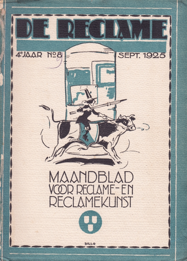 36. RECLAME, De De Reclame. 4e jaargang nr. 9. Den Haag, De Reclame, 1925. 28 x 20 cm. Genaaid, omslagontwerp H. Dillo. (68) p. Rijk geïllustreerd. Binnenin vier pagina’s op speciaal papier met illustraties van Tine Baanders en Machiel Wilmink. Veel advertenties. 1e druk. Rugje wat versleten en met lijmsporen. Overstekende randen iets gekreukt, verder in goede staat. Het foutief gedrukte nummer ‘8’ voorop met paars potlood verbeterd in ‘9’.