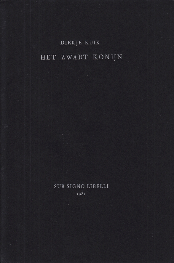 24. KUIK, Dirkje Het zwart konijn. (Met twee oorspronkelijke, genummerde en gesigneerde etsen door de auteur (los bijgevoegd)). Sub Signo Libelli, 1983. Ingenaaid met omslag. 8 p. Met de hand gezet en gedrukt in een oplage van 140 exemplaren. Dit is een boekje met één grote en één kleine losse ets.
