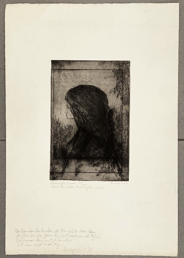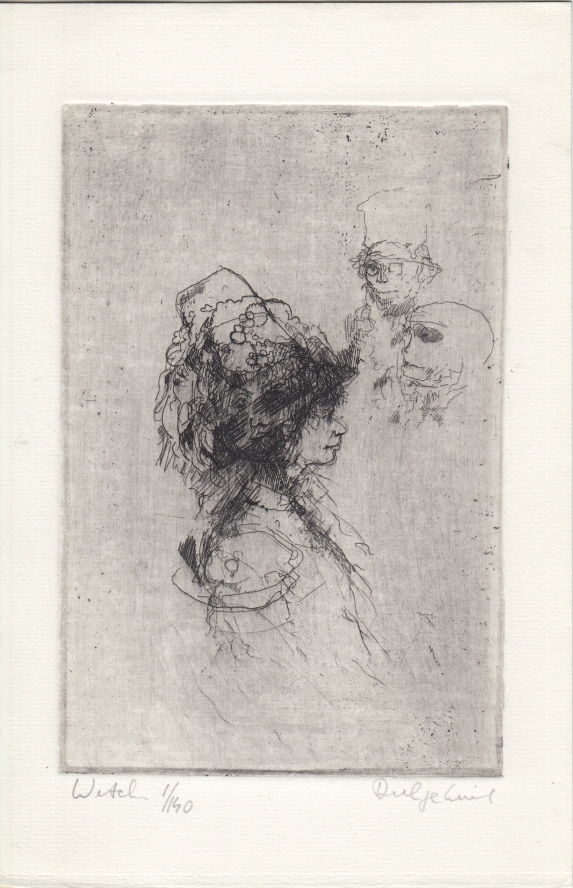 * NUMMER 1 VAN DE OPLAGE (de etsen zijn genummerd, het boekje niet (als gebruikelijk)). De ene ets is los ingevoegd achterin de uitgave, de andere ets is afgedrukt op groot formaat: 50 x 35 cm. De grote ets heeft een paar kreukjes aan de rechter onderderrand. Beide etsen zijn in potlood door de kunstenaar van een titel voorzien: ‘Lonneke 13 jaar’ en ‘Witch’. Gedrukt ter gelegenheid van het verschijnen van het eerste deel van de SSL-bibliografie door R. Breugelmans, 107 maal Sub Signo Libelli bij uitgeverij Reflex. Breugelmans 107.