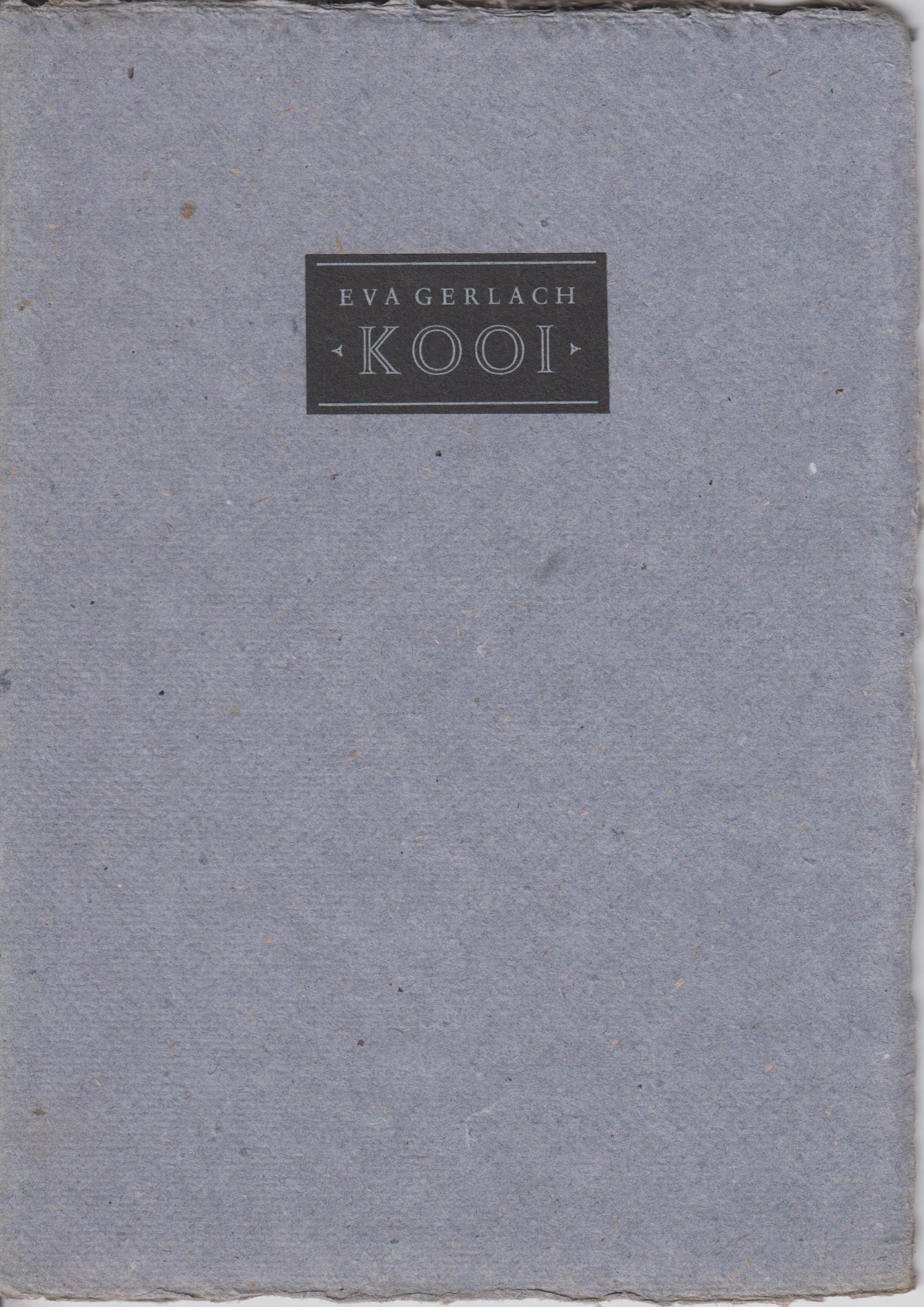 25. GERLACH, Eva Kooi. (Met een Aantekening door Gert Jan Hemmink). Amstelveen, AMO, 1987. Ingenaaid met omslag van Zaans bord, vervaardigd uit spijkerbroeken (lichtblauw met een zweem van indigo). (2), 18 p. Met de hand gezet uit de Romanée en gedrukt door Bram de Does in een oplage van 40 door de auteur genummerde en gesigneerde exemplaren. 1e druk. Omslag langs randen licht verkleurd (als altijd).
