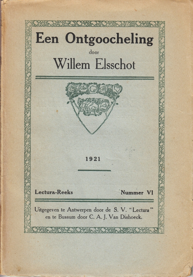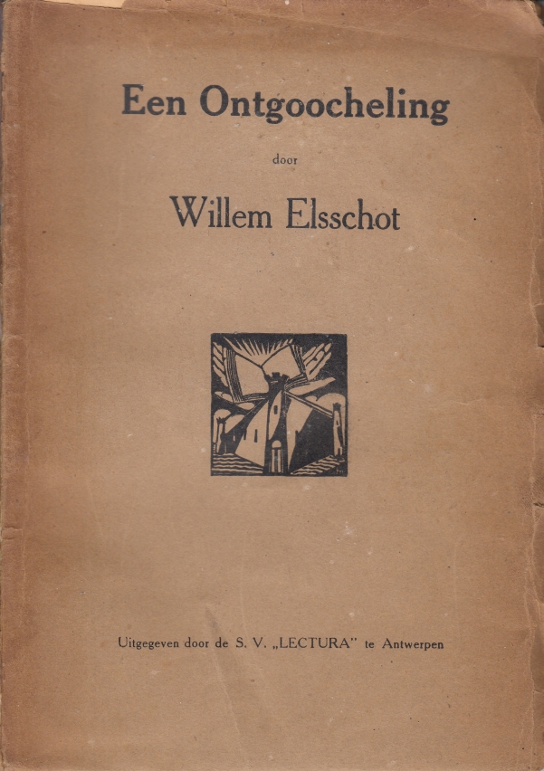 17. ELSSCHOT, Willem Een ontgoocheling. Antwerpen/ Bussum, Lectura/ Van Dishoeck, 1920. Ingenaaid (omslagvignet F[rans] M[asereel]). 80 p. 1e druk. Beschadigingen aan de rug, enkele scheurtjes in de uitstekende randen.