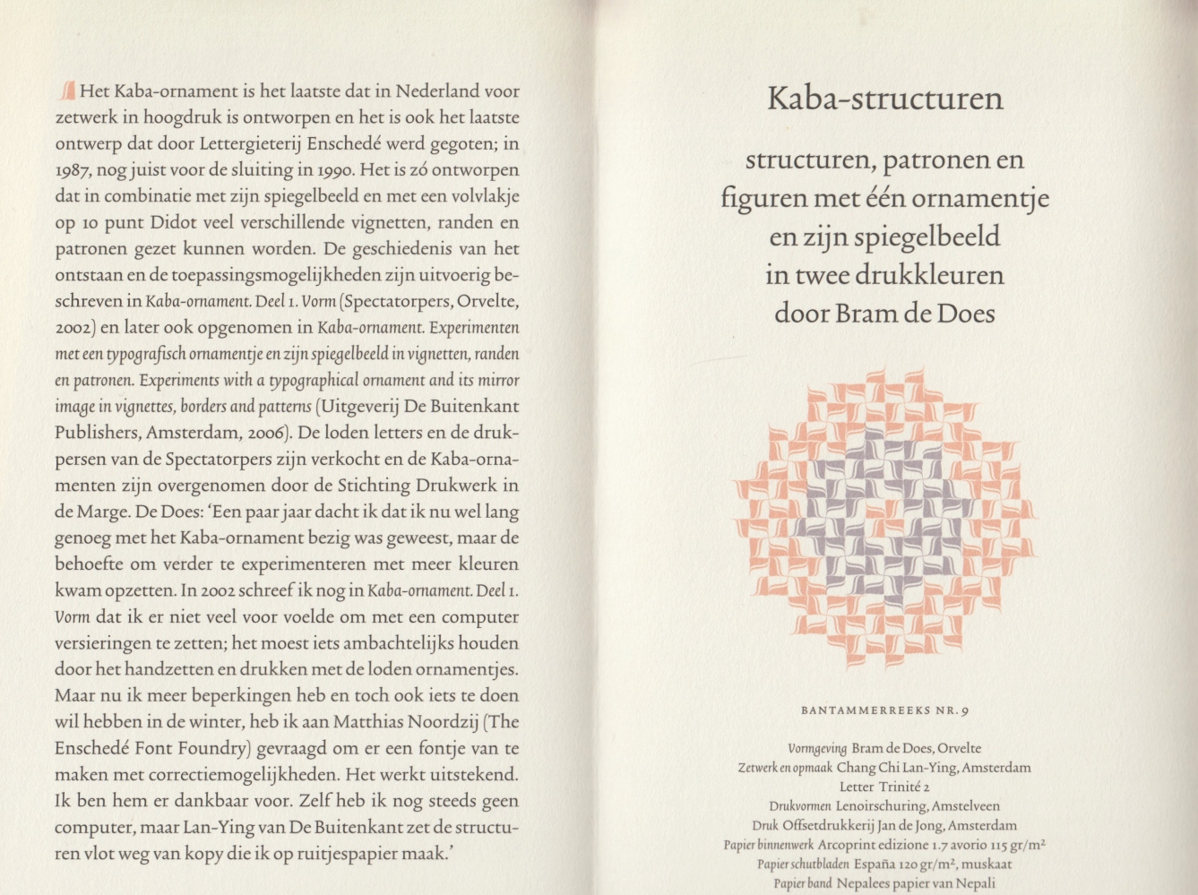 10. DOES, Bram de Kaba-structuren. Structuren, patronen en figuren met één ornamentje en zijn spiegelbeeld in twee drukkleuren. Orvelte/ Amsterdam, Spectatorpers/ De Buitenkant, 2011. Karton. 160 p. Gedrukt in een oplage van 225 exemplaren. Met prospectus.