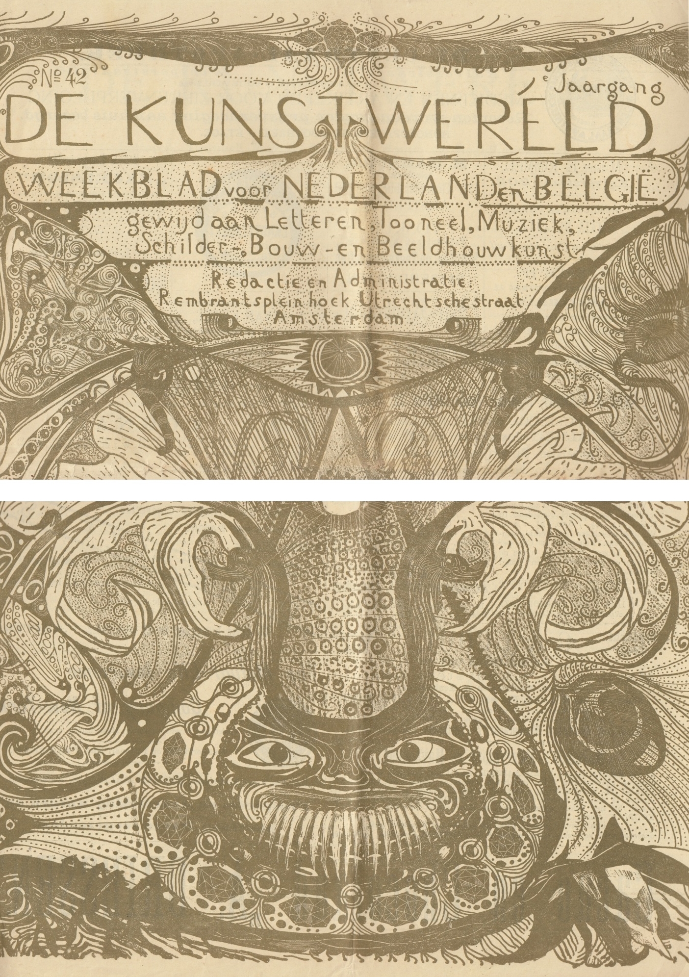 * Fantastische grote omslaglitho van Lion Cachet gedrukt in groen, met een monster tussen in facetten geslepen edelstenen, hurkend onder twee harpen. Bloem- en plantmotieven aan de zijkanten, alles in vroege art nouveau. In het blad ligt een groot portret van Richard Wagner. Met artikelen over kunst (o.a. Odilon Redon, over de Antwerpse Wereldtentoonstelling, en geschreven door o.a. Edward B. Koster en Charles van Deventer). Advertenties op de overige drie bladzijden van het omslag. Zeer zeldzame vroege art nouveau-lithografie van Lion Cachet, en in uitstekende staat, ongevouwen in het complete tijdschrift waar de litho voor gemaakt is! Braches Bouwstoffen 983.