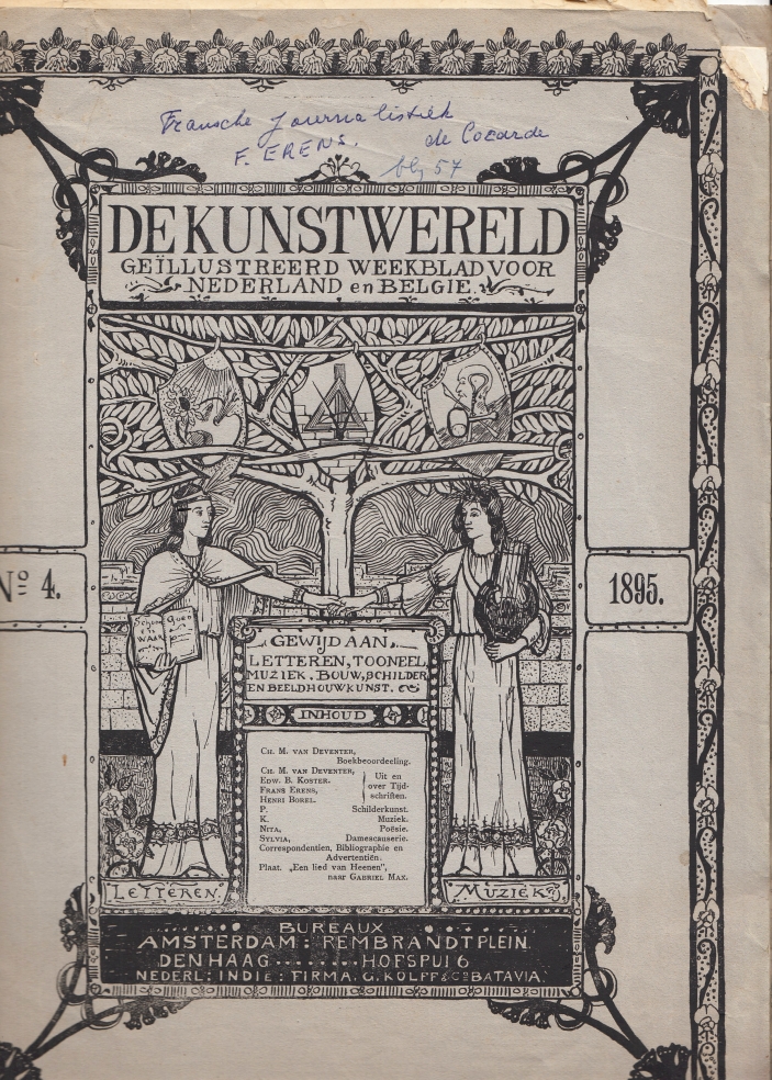 37. KUNSTWERELD, De De kunstwereld. Weekblad voor Nederland en België gewijd aan Letteren, Tooneel, Muziek, Schilder-, Bouw- en Beeldhouwkunst. 2e jaargang, no. 4. Amsterdam, De Kunstwereld, 1895. 31 X 22 cm. Origineel omslag (Jac. van den Bosch). (16) p. Met los inliggende kunstbijlage ‘Een lied van Heine’ (zwartwit-afbeelding van een schilderij). 1e druk. Rechterbovenhoekje afgescheurd, enkele pagina’s aan de hoek beschadigd. Met notities op de voorkant van Sophie Erens-Bouvy over een bijdrage van Frans Erens, ‘De Cocarde’ (zie de foto).