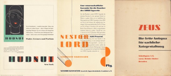 43. TSCHICHOLD, Jan Zeus – Die fette Antiqua für sachliche Satzgestaltung. (Letterproef). Dresden, Schriftguss AG vormals Brüder Butter, [1931]. Map met 25 plano’s en diploma’s (vouwbladen) met voorbeelden van deze vette letter, ontworpen in 1931 door Jan Tschichold.