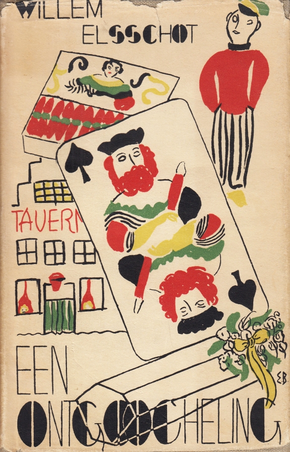 19. ELSSCHOT, Willem Een ontgoocheling. (Met een uitgebreide inleiding door Jan Greshoff). Amsterdam, Van Kampen, [1934]. Soepel karton met stofomslag (bandontwerp en stofomslag Emile Bron). (4), 160 p. [2e druk]. Stofomslag op rug en aan bovenzijde verstevigd met zuurvrije tape, roest op de sneden.