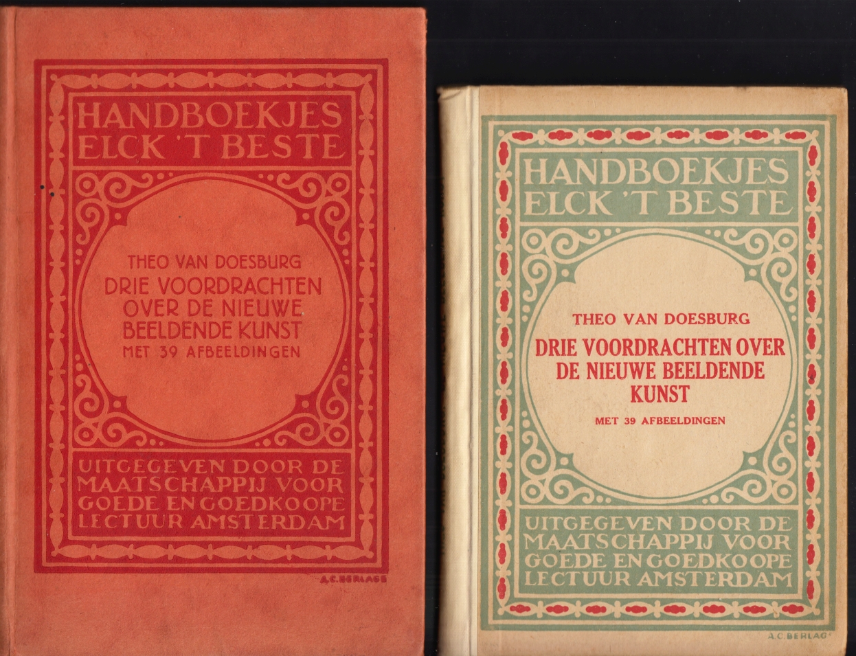 13. DOESBURG, Theo van Drie voordrachten over de nieuwe beeldende kunst. Haar ontwikkeling, aesthetisch beginsel en toekomstigen stijl. Met 39 afbeeldingen, van aanteekeningen voorzien door Theo van Doesburg. Amsterdam, Maatschappij voor Goede en Goedkoope Lectuur, 1919. 16,5 x 11,5 cm. Halflinnen (ontwerp A.C. Berlage). 104 p. Geïllustreerd. 1e druk.