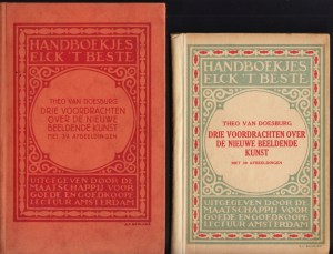 12. DOESBURG, Theo van Drie voordrachten over de nieuwe beeldende kunst. Haar ontwikkeling, aesthetisch beginsel en toekomstigen stijl. Met 39 afbeeldingen, van aanteekeningen voorzien door Theo van Doesburg. Amsterdam, Maatschappij voor Goede en Goedkoope Lectuur, 1919. 19 x 12,5 cm. Karton (ontwerp A.C. Berlage). 104 p. Geïllustreerd. 1e druk. Uitstekend exemplaar.