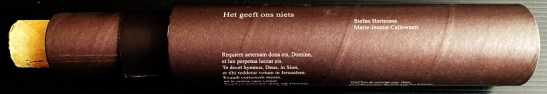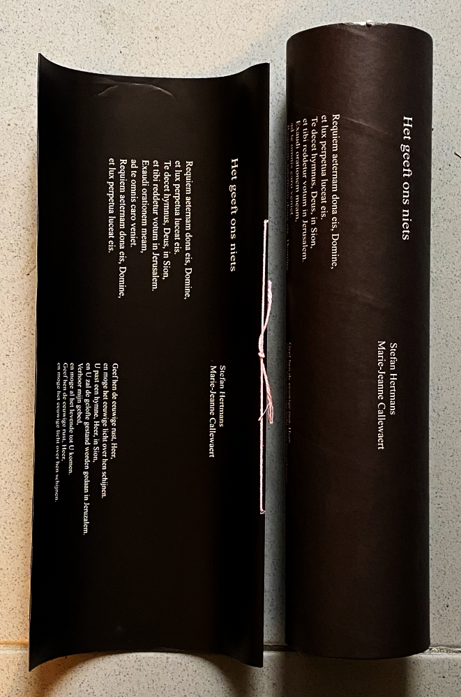 ‘Stefan Hertmans schreef 7 gedichten en Marie-Jeanne Callewaert maakte voor elk boek een uniek en exclusief doekwerk. Op vraag van Literarte lieten beide kunstenaars zich inspireren door de canonieke tekst van het Requiem. Het ontwerp is van Walter Lorent. Drukkerij ACCO verzorgde het drukwerk en Atelier Kaftwerk deed de afwerking’ (website Literarte).