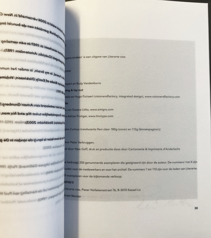 10. MORTIER, Erwin Naar nergens smaken (het scheppen van de schrijver). Kessel-Lo, Literarte, 2005. 26 x 19,5 cm. Genaaide vellen kunststofpapier met losse glazen platten in bijbehorende kartonnen doos. 40 bladen. Gezet uit de letters Mrs Eaves en Avenir en gedrukt in 250 genummerde en gesigneerde exemplaren op ArjoWiggins Curious translucent flexi clear 180g (omslag) en 112g (binnenwerk). 1e druk. Als nieuw.