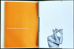 * ‘”Weg” is de theatertekst die Josse De Pauw presenteerde in samenwerking met Peter Vermeersch en Pierre Vervloesem. Koenraad Tinel, beeldend kunstenaar en vriend van de auteur maakte voor het boekwerk 33 aangrijpende tekeningen in roestbruine bister. De tekst is gezet uit de Trade Gothic op een grijs karton. Het boekwerk werd vormgegeven door G. Dooreman en gerealiseerd door drukkerij Imschoot, Gent.’ (website Literarte).