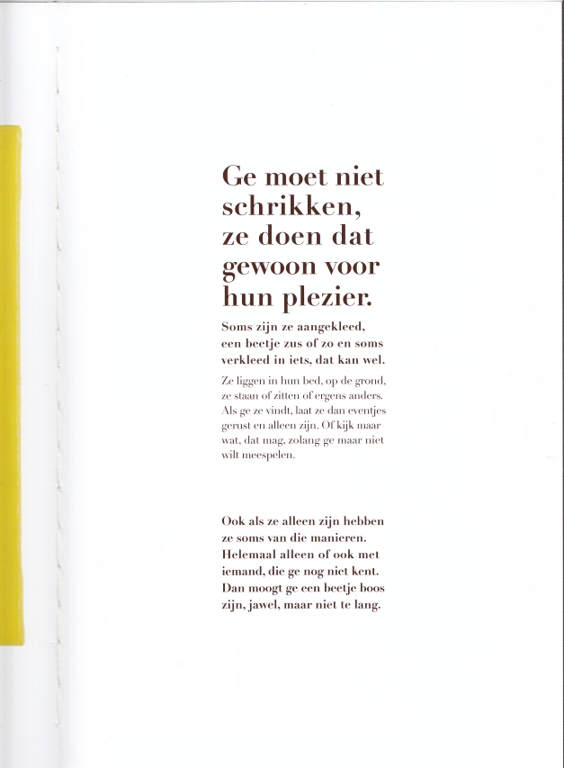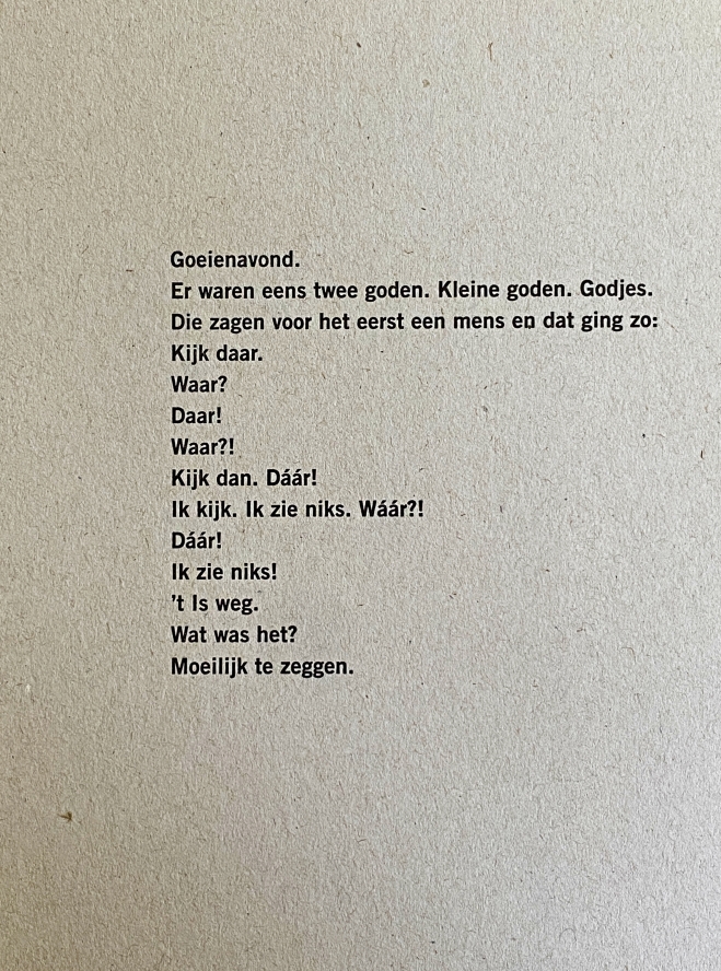 ‘Toon Tellegen schreef 39 onvoltooibare gedichten, dit is, gedichten die slechts gedeeltelijk als het ware onder het stof vandaan zijn gehaald, waar stukken uit ontbreken en die niet meer af te maken zijn. Via zeefdruk zijn de leeg gebleven plaatsen aangebracht zo dat ze ook voelbaar zijn. Christine Steel zorgde voor een sobere vormgeving. Drukkerij Lamine uit Herent drukte en Atelier Steel maakte de boekband’ (website Literarte).