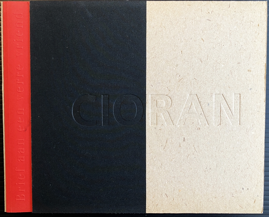 3. CIORAN, E.M. Brief aan een verre vriend. Vertaald door Katelijne De Vuyst (en) ingeleid door Luc Devoldere. [Kessel-Lo], Literarte, 1998. Oblong. 24 x 29,5 cm. Genaaid-gebonden in 300 grams Malmero-Teniers en 400 grams Fridakvist, deels beplakt met zwart linnen (Imschoot, Gent). Oblong. 56 p. Vormgeving Danny Dobbelaere. Gedrukt in een oplage van 155 (+ 30) genummerde exemplaren. 1e druk.