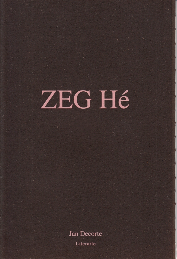 * “Zeg Hé” van toneelregisseur Jan Decorte bevat drie direct aansprekende brieven aan zijn jeugdig petekind, getiteld ‘Dag Hé’, ‘Dood Hé’ en ‘Seks Hé’. Johan Daenen maakte er 5 schilderijtjes bij. Brieven en schilderijen werden bibliofiel vorm gegeven door Filip Daniëls die er een ingenieus harmonikaboek van maakte. De druk was in handen van Drukkerij Lamine uit Herent. Het omslagkarton is (donkerbruin) Bier 250 gr. Het binnenwerk is Conqueror Smooth CX 22 wit 160 gr. Activering De Link uit Mortsel zorgde voor de afwerking. Literarte 18.
