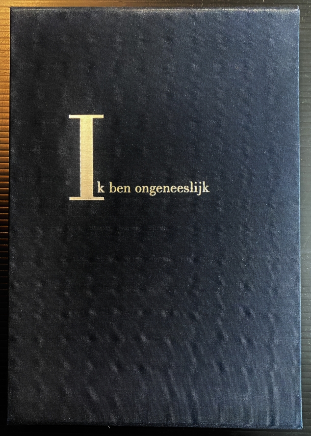 18. WISPELAERE, Paul de Ik ben ongeneeslijk. (Met tekeningen van Karel Dierickx). [Kessel-Lo], Literarte, 2004. 34,5 x 24 cm. Ingenaaid met kartonnen platten. Twee delen in linnen cassette. (24; (12) p. Vormgeving Bob Matthysen. Gedrukt in een oplage van 140 (+ 10) genummerde en door auteur en kunstenaar in beide delen gesigneerde exemplaren. 1e druk.