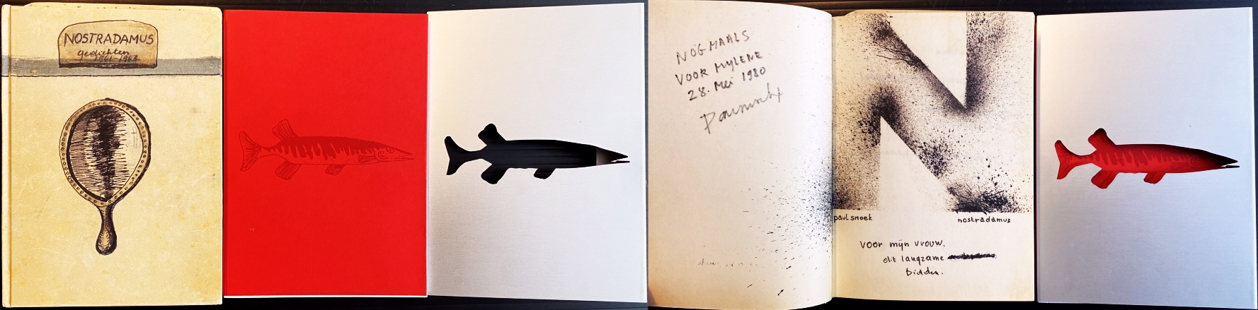 14. SNOEK, Paul Nostradamus. [Kessel-Lo], Literarte, 2001. 20 x 14 cm. Twee delen in aluminium ‘klem’, waarin een uitsparing in de vorm van van een snoek. Karton (met bijlagen) en garenloos (Chinese blokboekbinding). Vormgeving Bob Matthysen. Gedrukt in een oplage van 160 (+ 15) genummerde exemplaren. 1e druk.