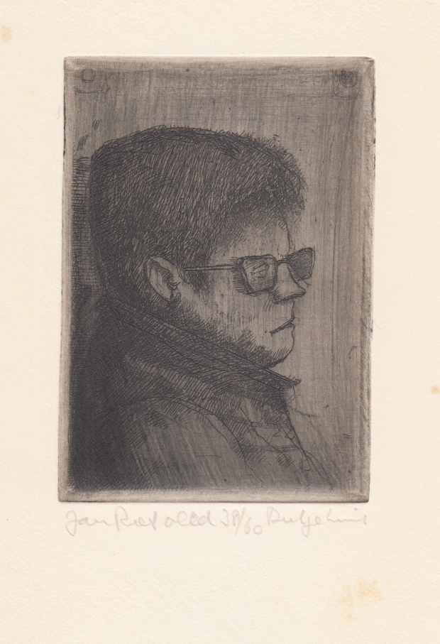 * Eén van de (60?) exemplaren met een los bijgevoegde, originele, genummerde en gesigneerde ets van Dirkje Kuik: een portret van Jan Rietveld en profil.