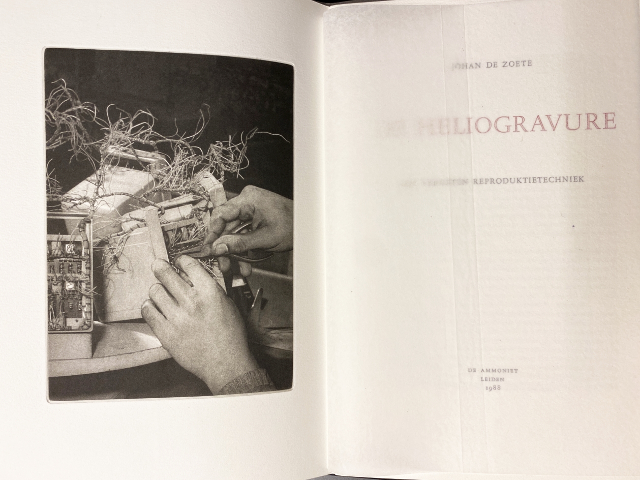 46. ZOETE, Johan de De heliogravure. Leiden, De Ammoniet, 1988. Genaaid. 12 p. Met als frontispice een originele heliogravure. Met de hand gezet uit de Romulus en gedrukt in 140 genummerde exemplaren op zwaar Hahnemühle etspapier. 1e druk. Mooi.