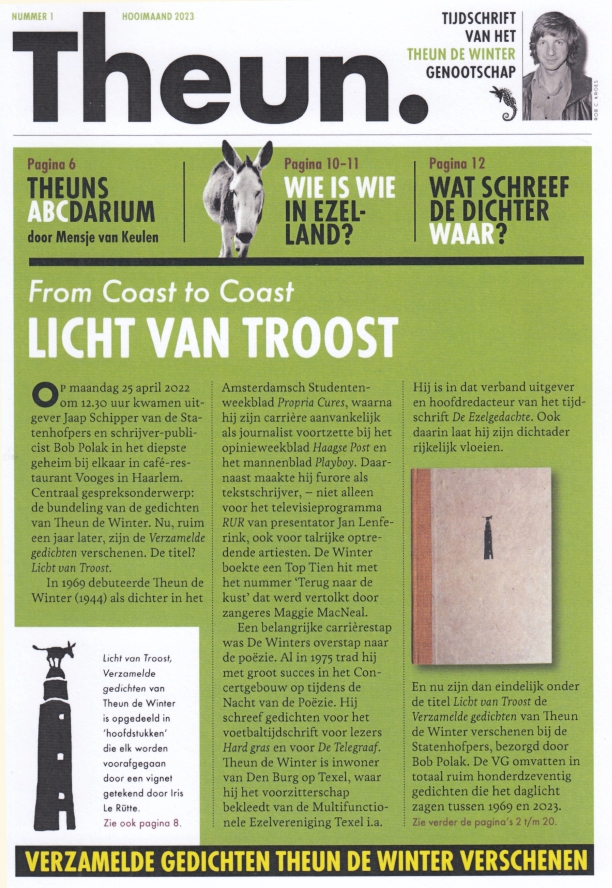 Bijgevoegd: Theun. Tijdschrift van het Theun de Winter genootschap. Aflevering 1 (juli 2023). Geniet. 20 p. Geïllustreerd. Dit informatieve blad is een van de 100 exemplaren die gesigneerd werden door redactie en medewerkers: Christianne Duchateau, Mensje van Keulen, Bob Polak, Iris le Rütte, Jaap Schipper en Piet Schreuders! Het is echter niet genummerd.